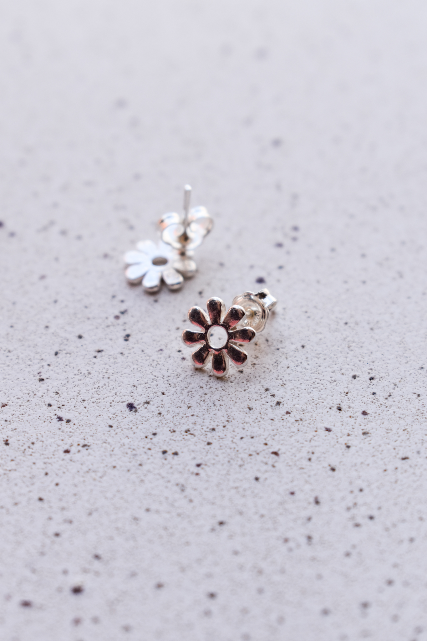 Brinco flor margarida com miolo vazado. Fechamento em tarraxa.